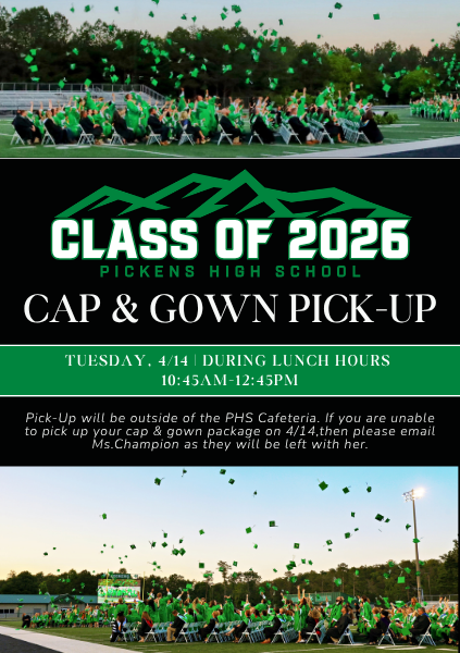 Class of 2026, save the date for Tuesday, April 14th, to pick-up your cap & gown orders (cap, gown, & tassel only) from 10:45am-12:45pm outside the PHS Cafeteria! If you are unable to come to PHS on April 14th, then please email the PHS Graduation Coach, Ms. Champion at janachampion@pickenscountyschools.org, as all leftover packages will be left with her.